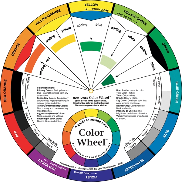 This 2-sided color wheel visually illustrates relationships between colors and demonstrates the results of color mixing. The mix side shows colors mixed with each other or with black and white. The harmony side shows analogous and complementary colors. It features a gray scale, tints, tones, and definitions of color terms.