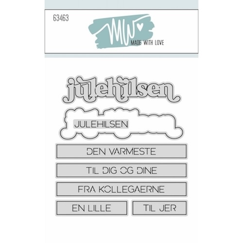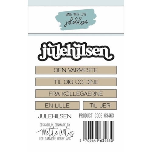 1 stor Julehilsen tekst, 1 løs julehilsen tekst og 5 labels med tekster der kan bruges til at kombinere på kryds og tværs.