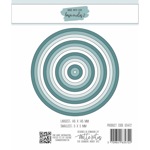 Basic Circles 2 fra Made With Love indeholder 15 dies med helt simple cirkler. Sæt nr 2 indeholder cirkler i størrelsen Ø14,5cm til Ø0,5 cm og halve centimeter derimellem (f.eks. 13.5, 12.5, 11.5 osv.)