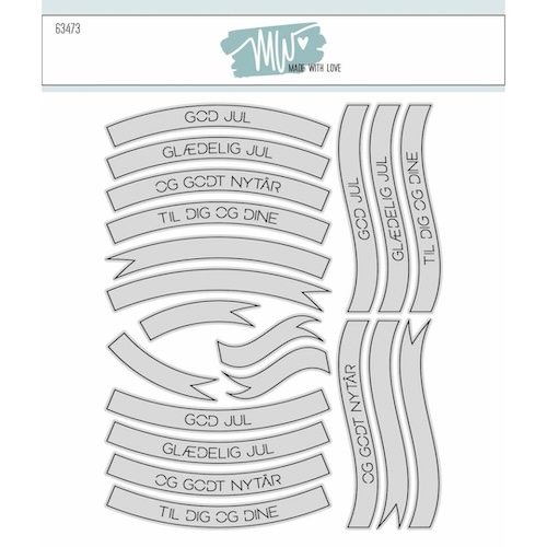 Christmas Banners fra Made With Love indeholder 4 forskellige tekster "God jul", "glædelig jul", "og godt nytår" og "til dig og dine". Hver tekst findes i 3 forskellige banner typer som kan bruges for sig selv eller kombineres med andre tekster eller banner haler for at lave sammenhængende tekst bannere.