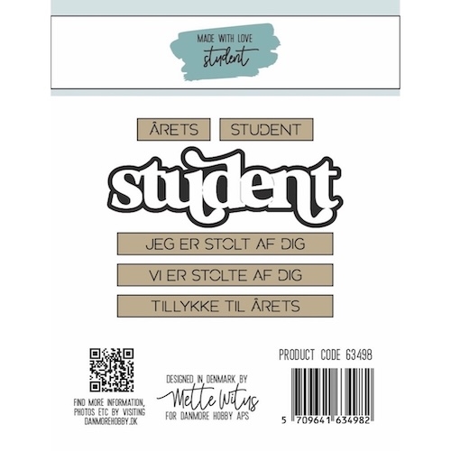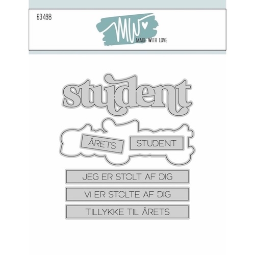 Student fra Made With Love indeholder 7 tekst dies: 1 stor student med skygge og 5 label tekster.