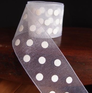 Halv-gennemsigtigt organza-bånd med hvide prikker.