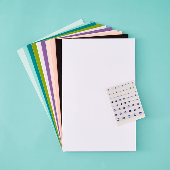The class kit includes one half sheet of Prism AB Color Essentials Gems, and one half sheet each of Colorwheel Cardstock in the following colors: