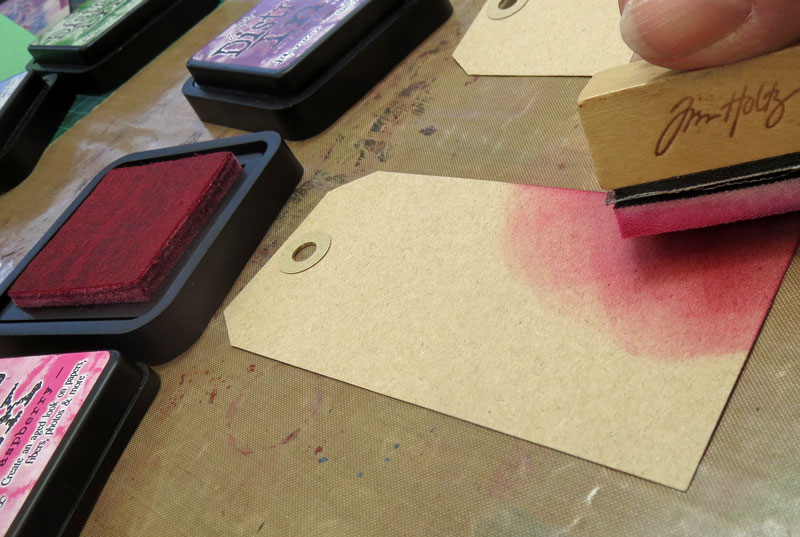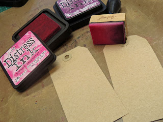 Først skal kartonen (jeg har brugt tags i kvistkarton / kraftkarton) sværtes godt ind i Distress Ink sværte - det skal endelig være en vandbaseret sværte for at det fungerer.