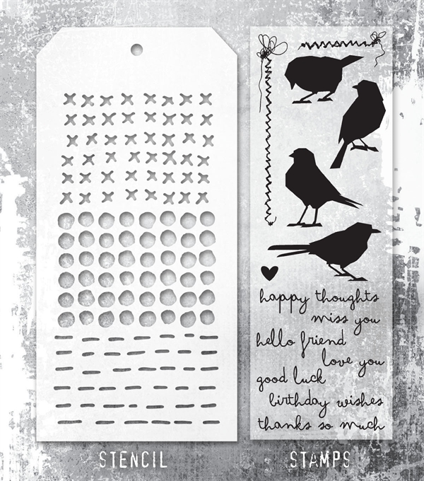 Superfedt sæt med en stencil i str. 4.125"X8.5" (ca. 10,5 x 21,6 cm) med flere forskellige motiver på samt et ark med clear stamps, som motivmæssigt stammer fra nogle af de klassiske Tim Holtz stempelsæt, men som her er lavet i nye kombinationer og størrelser.