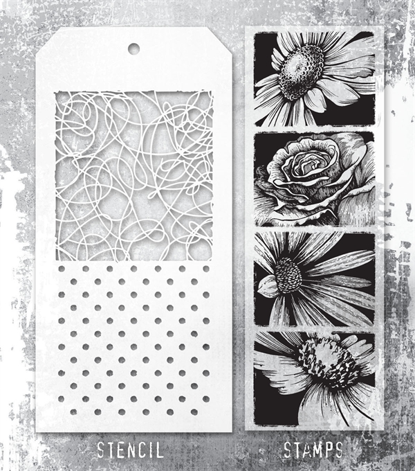 Superfedt sæt med en stencil i str. 4.125"X8.5" (ca. 10,5 x 21,6 cm) med flere forskellige motiver på samt et ark med clear stamps, som motivmæssigt stammer fra nogle af de klassiske Tim Holtz stempelsæt, men som her er lavet i nye kombinationer og størrelser.
