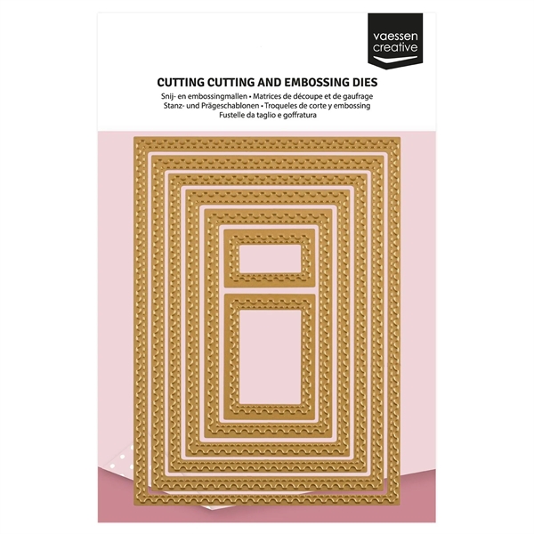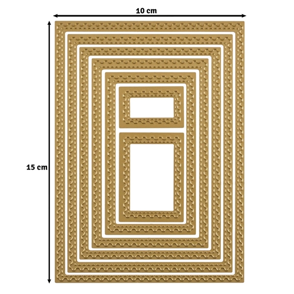 • Dimensions cutting dies: 4.7 x 6.3 in - 3.9 x 5.9 in - 3.5 x 5.1 in - 2.8 x 4.7 - 2.2 x 3.9 in - 0.8 x 1.4 in - 1.4 x 2 in