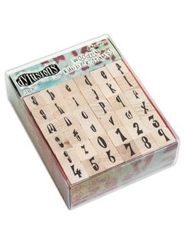 Gummistempler monteret på træklodser - hele alfabetet (dog uden Æ-Ø-Å) og tallene fra 0-9